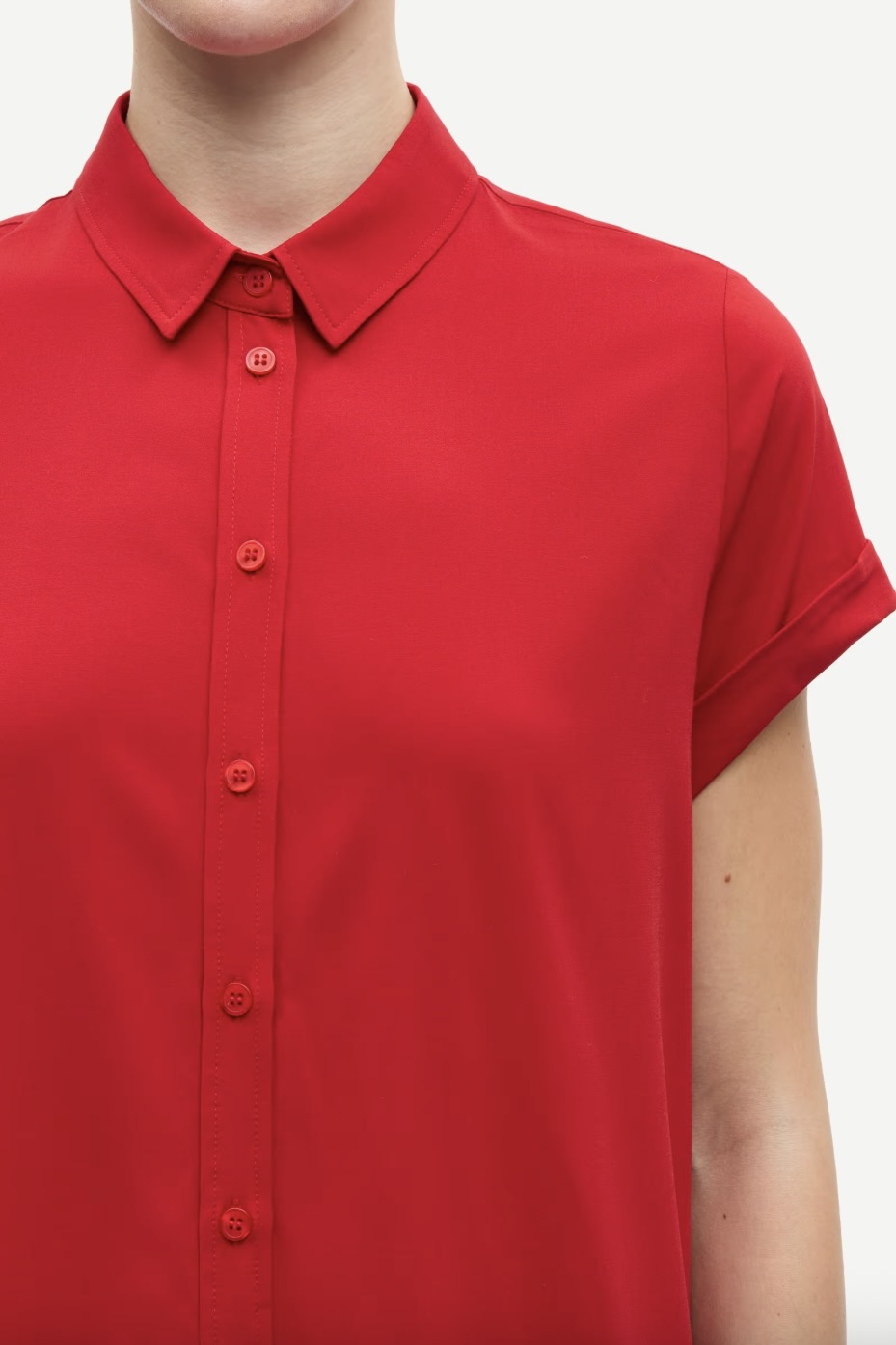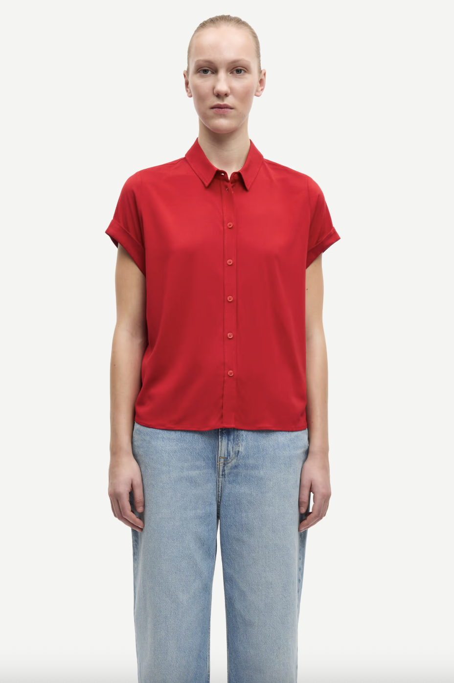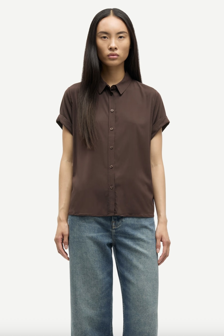 Short-sleeved shirt with a regular fit. Button closure on the front. Neck yoke seam with pleated detailing. Main material made from an elastic LENZING™ ECOVERO™ viscose-blend. This product contains LENZING™ ECOVERO™ Viscose, certified with the EU Ecolabel for meeting high environmental standards.