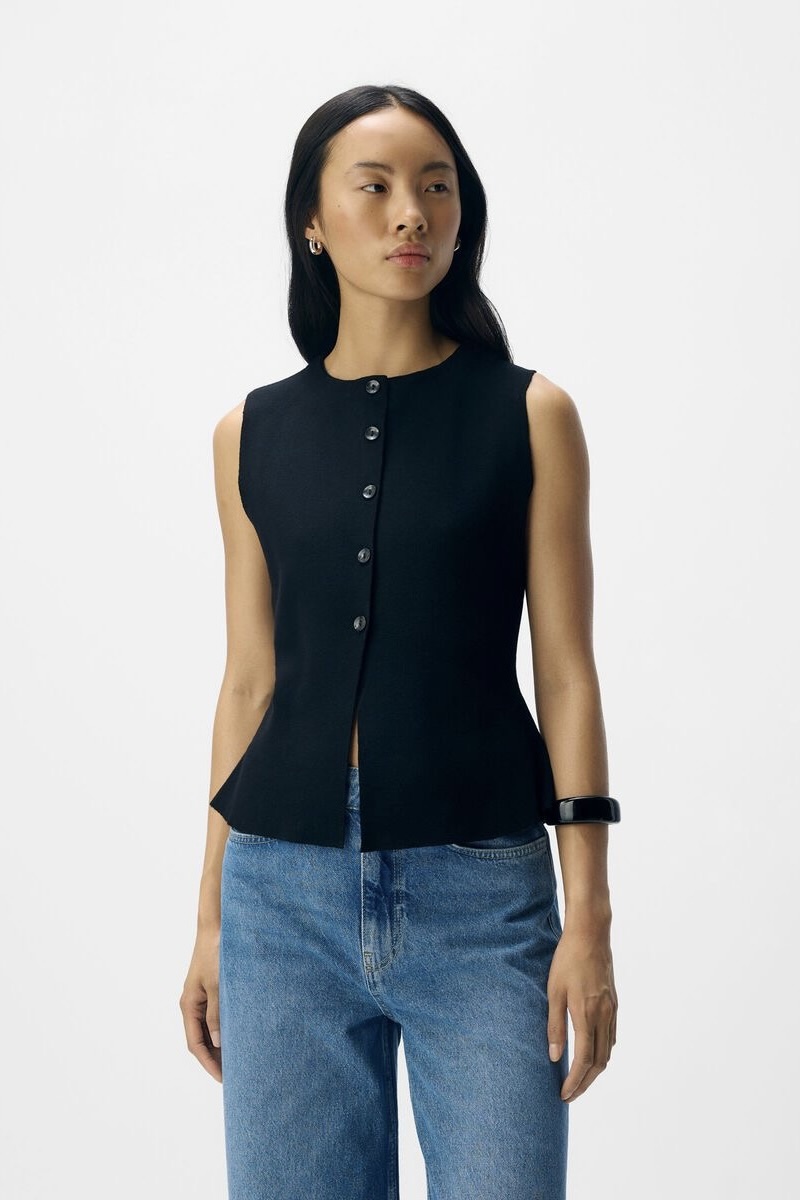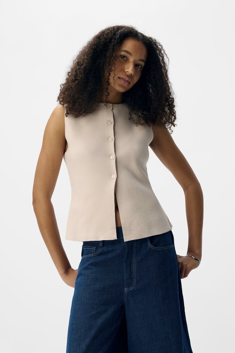 - Gebreid vest - Ronde hals - Knoopsluiting aan de voorkant - Wijde zoom - Regular fit