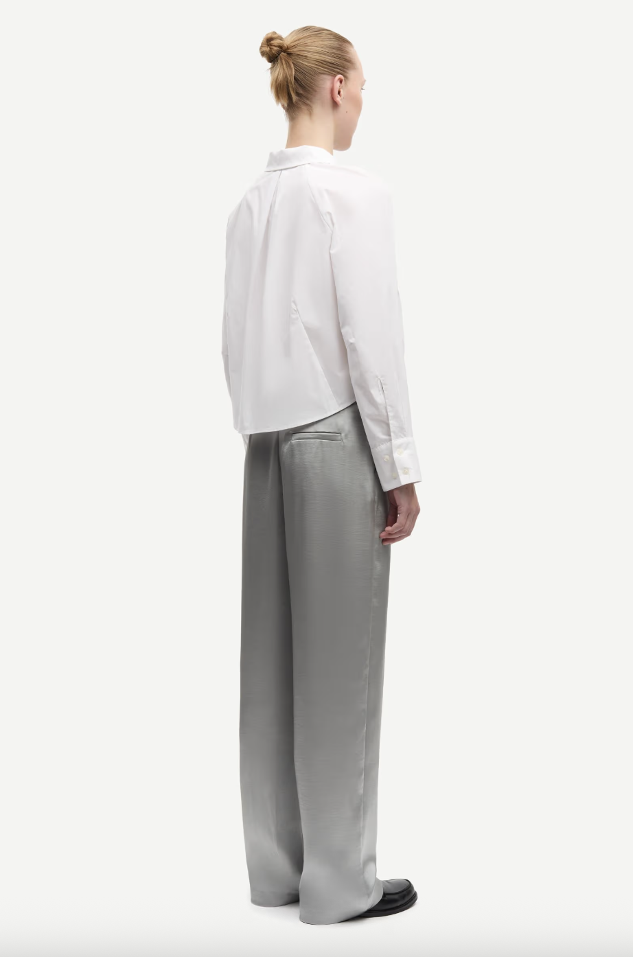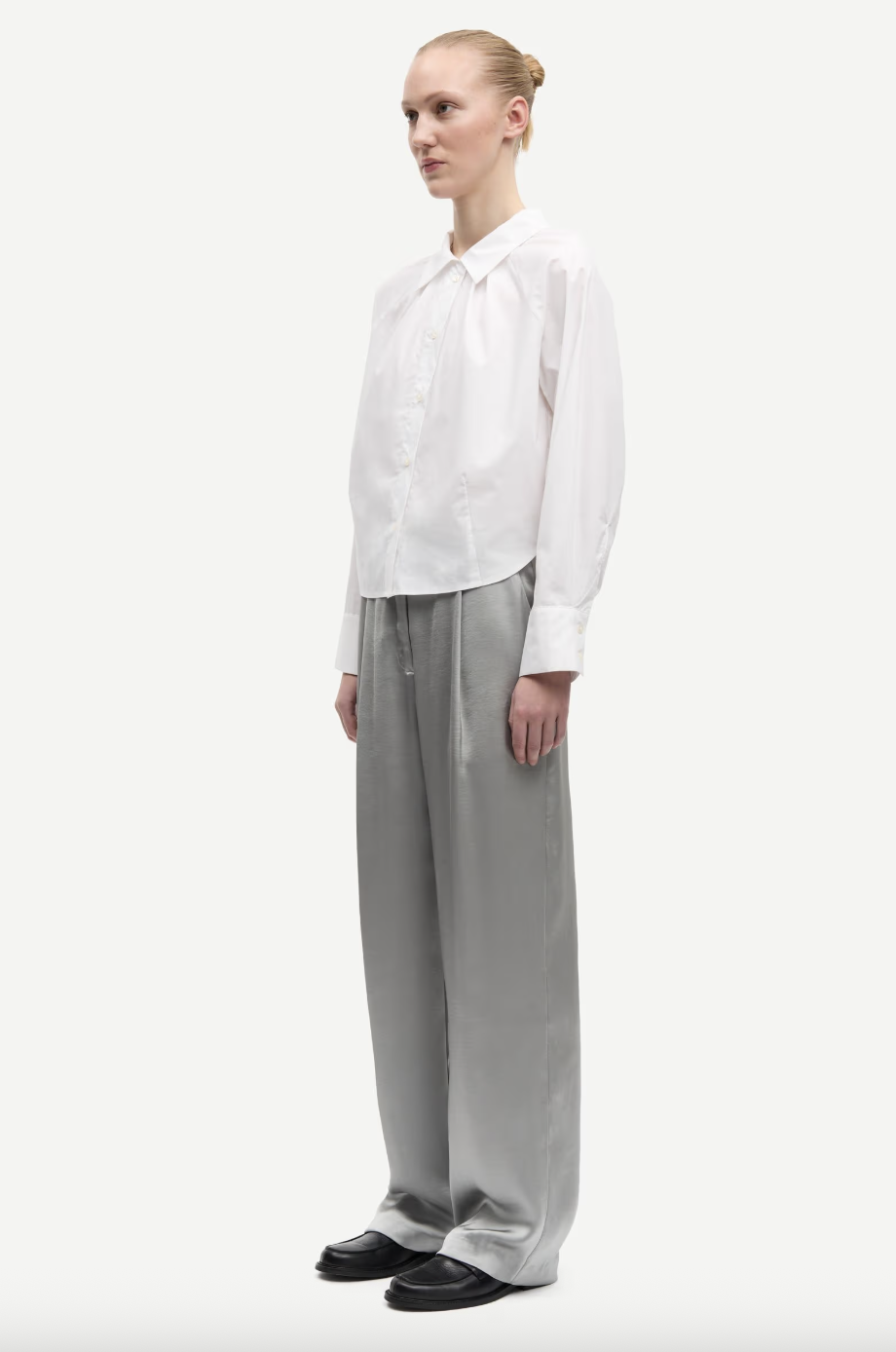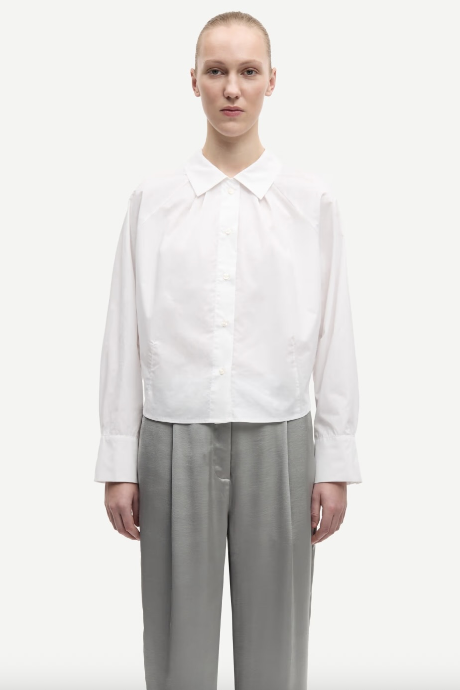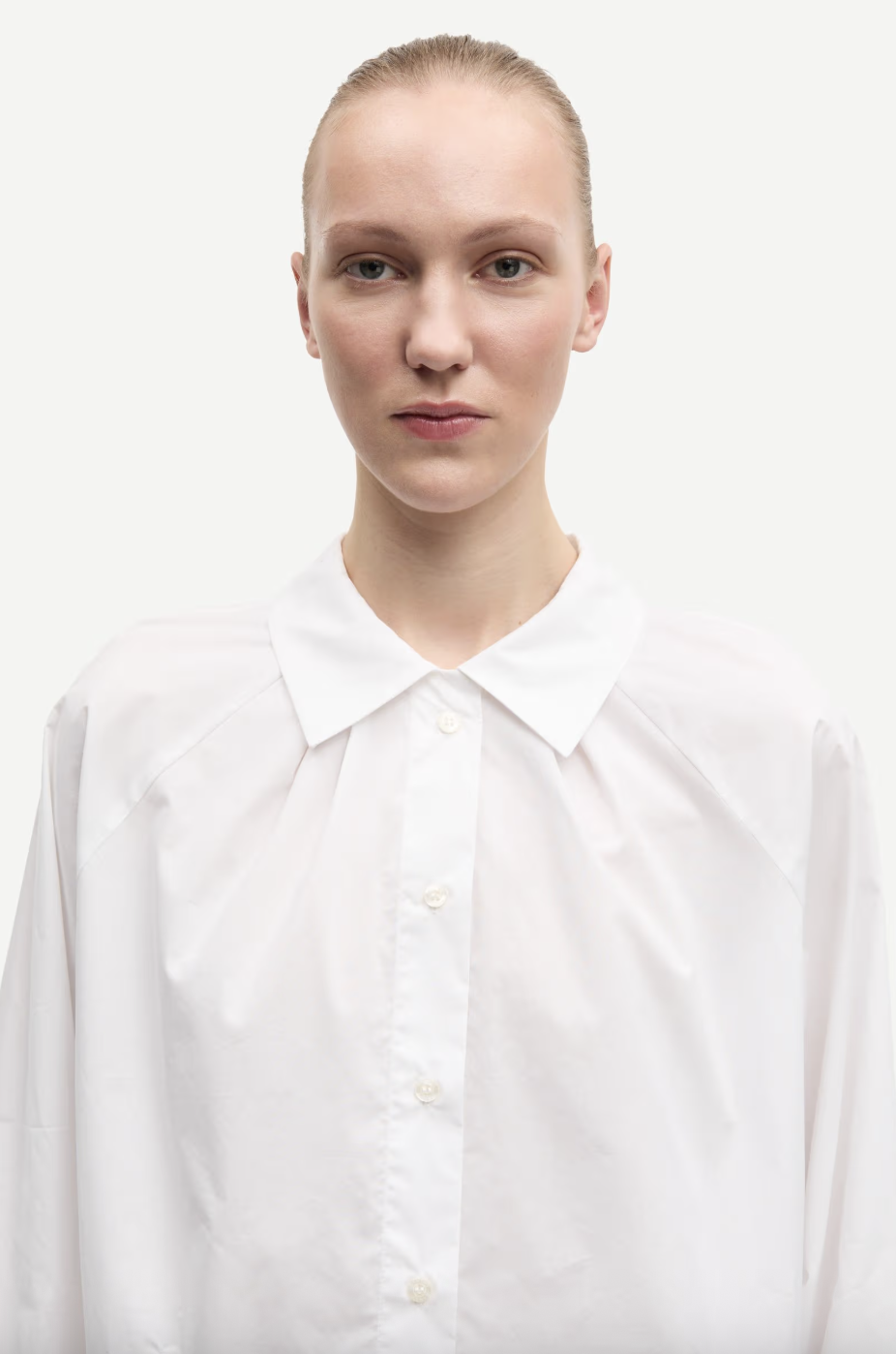 Long-sleeved shirt with a loose fit and curved sleeves. Button closure on the front and buttoned cuffs. Rounded hem. Draped detailing below the collar. Neck yoke seam. Main material made from 100% organic cotton. This product is GOTS certified. Each stage of the supply chain has met strict social, environmental, and chemical requirements.